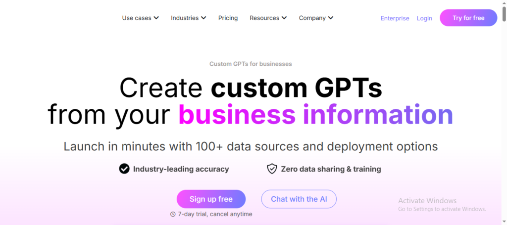 CustomGPT trains on your data for personalized chatbots, ideal for niche queries. No-code setup yields quick wins; $49/month. Pros: Flexible; cons: Relies on quality training data.